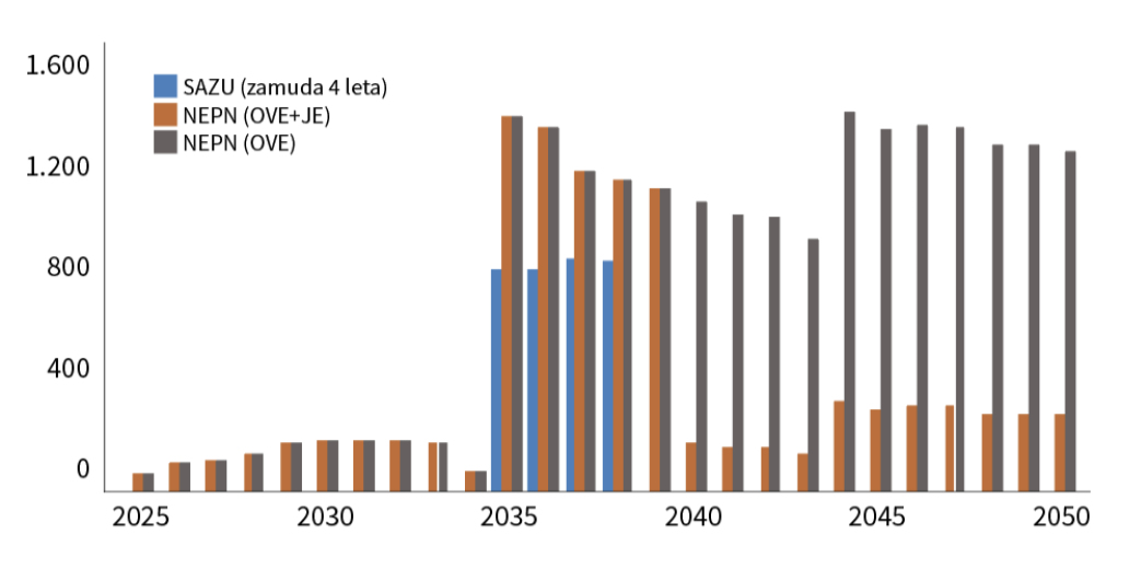 Naši izračuni, prikazani v sliki 1, kažejo, da bi zamik izgradnje JEK2 za štiri leta (vključitev v omrežje leta 2039 namesto 2035) pomenil, da bodo ob upoštevanju uvozne cene električne energije v višini 1