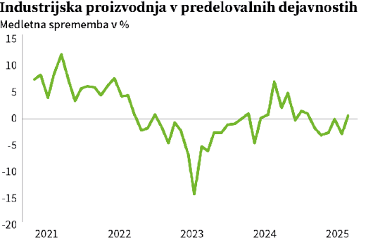 Proizvodnja v predelovalnih dejavnostih je bila v prvih sedmih mesecih leta 2025 glede na enako obdobje predhodnega leta še vedno nižja, in sicer za 1,1 %. V obdobju med majem in julijem 2025 glede na enako obdobje v predhodnem letu je industrijska proizvodnja upadla za 1,3 %, v predelovalnih dejavnostih za 0,7 %. Nižja je bila proizvodnja srednje visoko tehnološko zahtevnih proizvodov (za -4 %) in srednje nizko tehnološko zahtevnih proizvodov (-2,4 %). Porasla je proizvodnja nizko tehnološko zahtevnih proizvodov (za +4 %) in ponovno tudi visoko tehnološko zahtevnih proizvodov (+1,7 %; zdravila, letala).