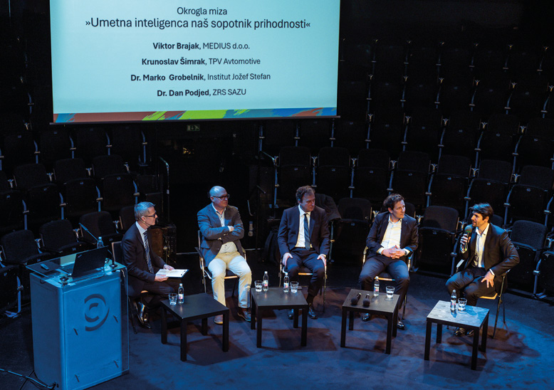 Na okrogli mizi o umetni inteligenci so sodelovali: Viktor Brajak (MEDIUS), Krunoslav Šimrak (TPV Automotive), dr. Marko Grobelnik (Institut Jožef Stefan) in dr. Dan Podjed (ZRS SAZU).