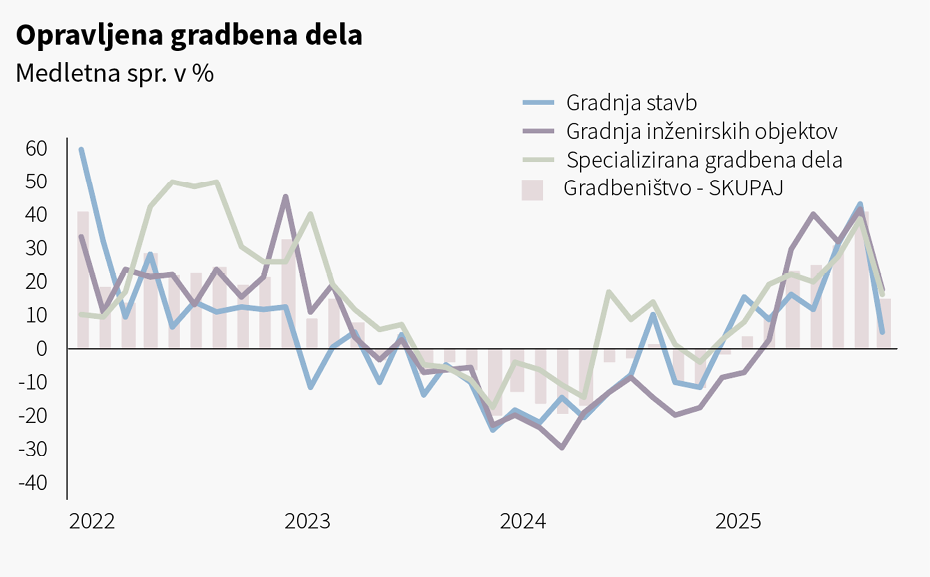 Obseg opravljenih gradbenih del je v prvih enajstih mesecih leta 2025 porasel za desetino, pri čemer je bil novembra medletno višji za 12,2 % in predstavlja sedmo zaporedno mesečno rast na letni ravni. Povečanje je posledica rasti specialnih gradbenih del (14,9 %), višje gradnje stavb (za desetino) kot tudi gradnje inženirskih objektov (7,3 %). Število izdanih gradbenih dovoljenj za stavbe (brez gradbeno-inženirskih objektov) je bilo v Sloveniji v letu 2025 za 1,7 % večje kot leta 2024, kar je prvi porast po treh letih upadanja. Merjeno po skupni površini stavb pa je bila z gradbenimi dovoljenji predvidena površina nižja za 6,4 %.